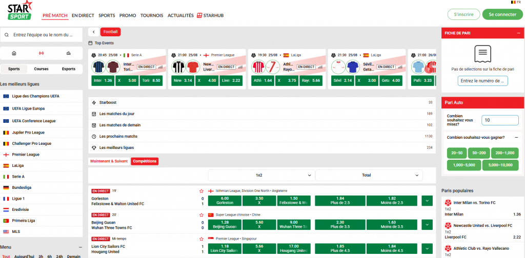 Vibrez tout en pariant avec StarSport Foot, la référence pour les paris sportifs en ligne. Que votre passion se porte sur la Premier League, la Ligue des Champions, la Ligue 1, ou d’autres compétitions moins connues, vous y trouverez des milliers de matchs sur lesquels parier. StarSport foot propose également une gamme complète d’options, des paris classiques aux StarBoosts exclusifs qui augmentent vos gains potentiels. Avec une interface intuitive, des cotes compétitives et des analyses détaillées, StarSport foot vous offre tous les outils pour maximiser vos chances de succès. N’attendez plus pour placer vos pronostics et rejoindre une communauté de passionnés.